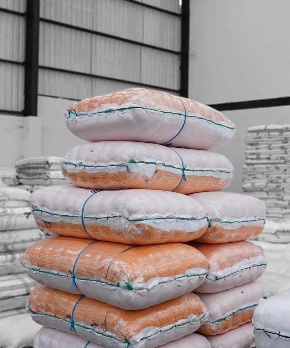 kantong jaring yang dianyam dengan pola yang renggang terbuat dari bahan plastik polypropylene.